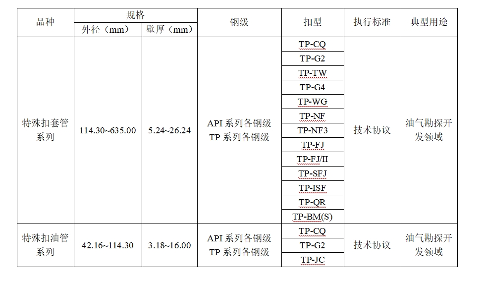 我公司拥有当今世界先进的包括原料海绵铁、炼钢、轧管、钢管精整加工等工序在内的石油套管生产线。公司可生产API系列所有钢级,近年来还根据市场的不同需求,研制开发了多种非API标准的石油套管,形成了自己的TP产品系列,丰富了国产石油套管的规格品种,为不同的使用需求,提供了多样性的选择。