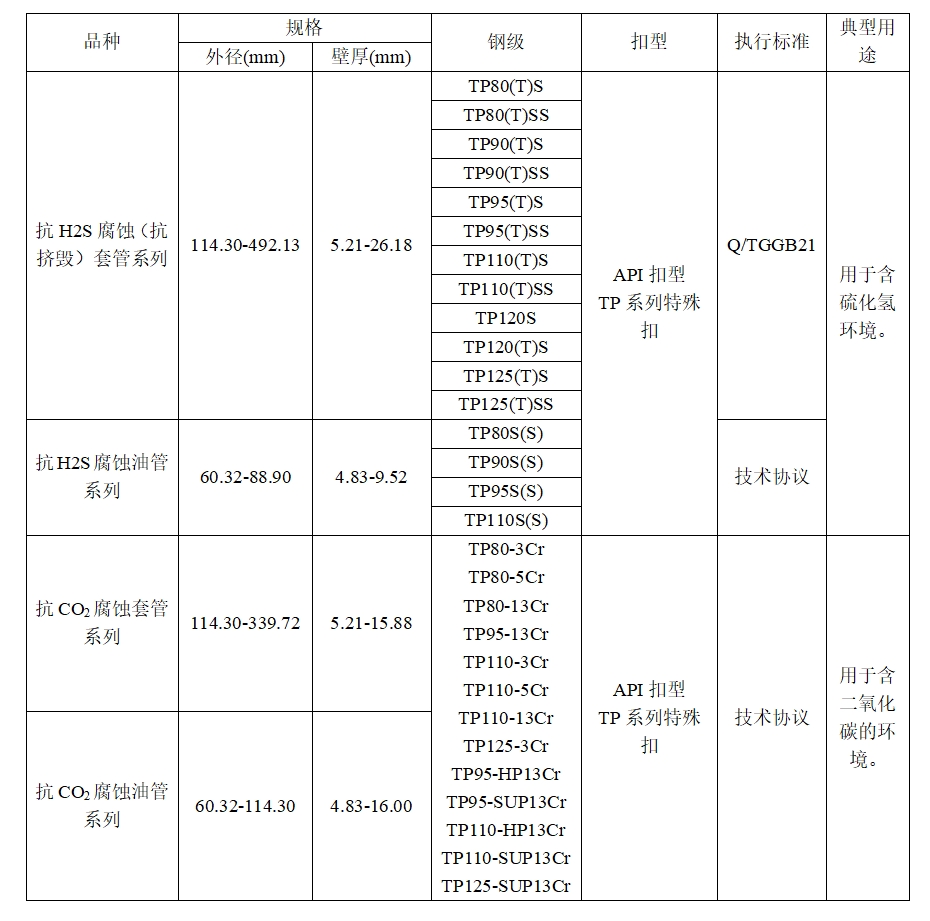 针对高含硫化氢油气井开发的需要,我公司研制了强度从80钢级到125钢级的TP-SS系列抗硫化氢应力腐蚀油井管,该系列产品具有优异的抗硫化氢应力腐蚀开裂性能,并可根据客户需要提供高于API的抗挤毁性能。目前,该系列产品已经广泛应用于四川、塔里木和国内外海上油气田高含硫化氢区块的开发。近几年,抗硫化氢应力腐蚀油井管又陆续通过了多家国际知名油公司的产品评价试验,出口到北美、中东和东南亚地区。